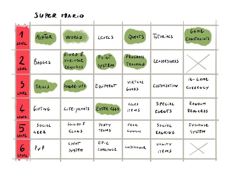 Végezetül vezessük le egy egyszerű, mindenki számára ismerős játékon, a Super Marion keresztül a Gamification Canvas keretrendszer működését. Mindössze nagyjából 10 mechanizmussal leírható az egész játék, amely azt példázza, hogy milyen kevés is elég ahhoz, hogy egy nagyon jó (és időtálló) játékot alkossunk meg, ráadásul egy eléggé szembetűnő minta is kirajzolódik belőle. Az első szintből négy, a másodikból három és végül a negyedikből már csak egy mechanizmust használ fel.